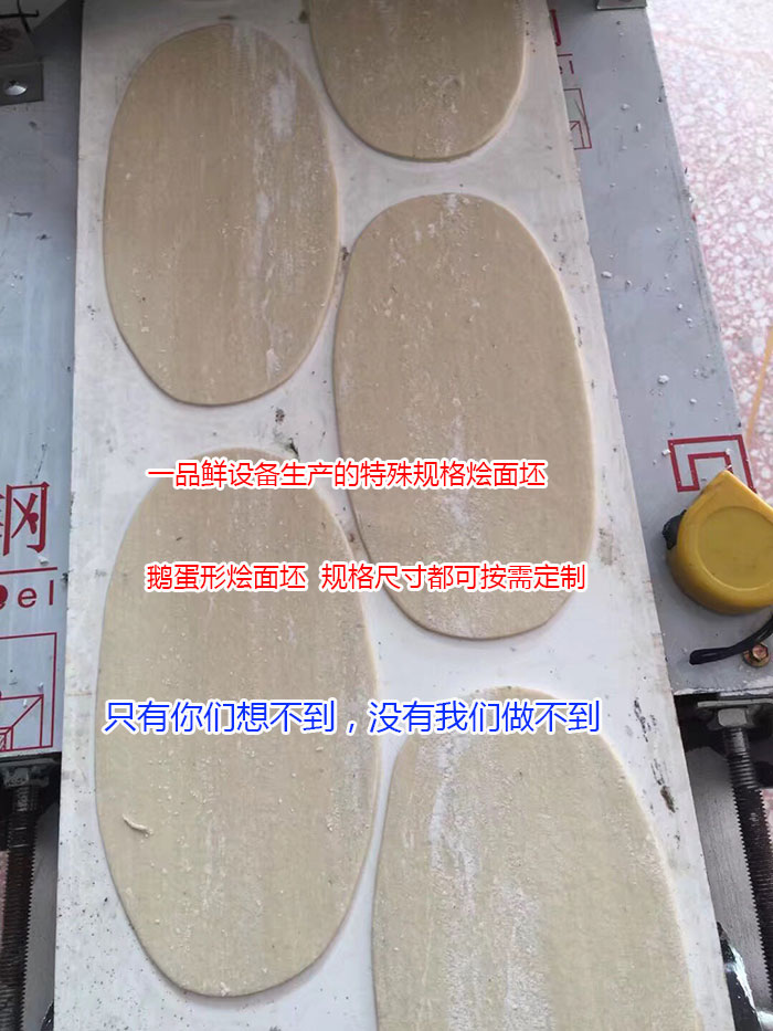 19年的面食機(jī)械生產(chǎn)經(jīng)驗(yàn),讓一品鮮掌握了更實(shí)用的生產(chǎn)技術(shù)?蛻(hù)需要各種特殊規(guī)格的面坯,我們均可生產(chǎn)出來(lái)。以下圖片就是一品鮮設(shè)備生產(chǎn)的燒餅坯,荷葉餅,扯面坯(12公分3道印),鵝蛋型燴面坯和特殊燴面尺寸。